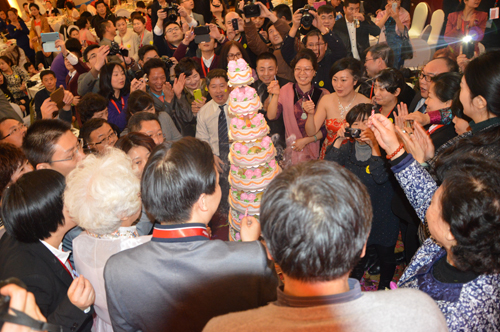 在晚宴进行大半,全场灯光减弱,伴随着轻扬的《生日快乐》歌曲,来自于全国的校长代表团推着一人多高的生日蛋糕从外场缓缓进入,全场点燃祝福的烛光,世健联,十岁了,带着大家深深的祝福,世健联健商医学研究院--魏跃院长,“公众妈妈”--孙树侠,中国健康促进与教育协会---颜焕珠主任,国家发改委公众营养与发展中心--于小冬主任,韩国互助信用协会会长--朴祉润女士,共同开启蛋糕盛宴!